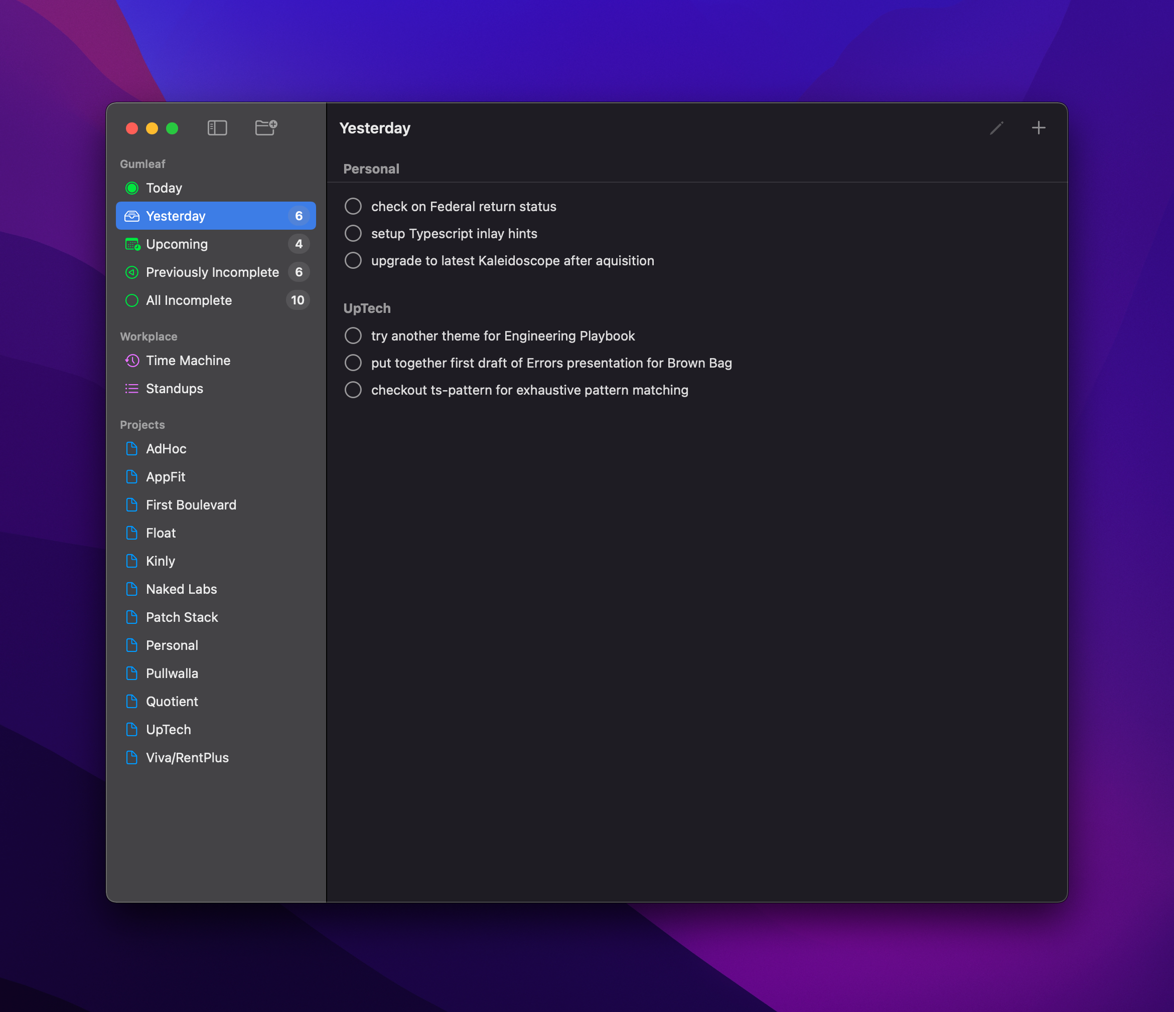 Gumleaf is a side project of Drew De Ponte & Anthony Castelli where the beta release is being shared with Uptech Studio to get feedback. It is a personal task management solution built around the concept of daily standups and also provides features to trivially scope standups down to specific clients as well as export standups in the Slack format.