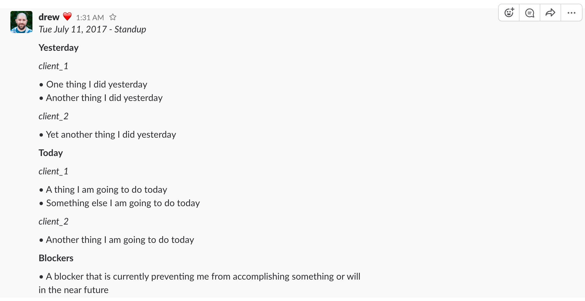 Then in the #standups channel we communicate the classic standup information: What did I do yesterday?, What am I doing today?, Do I have any blockers? Specifically, we use the following template and generally prepare the mornings standup in a text buffer before pasting it into the #standups channel. The template/example below is based on the Slack message format.