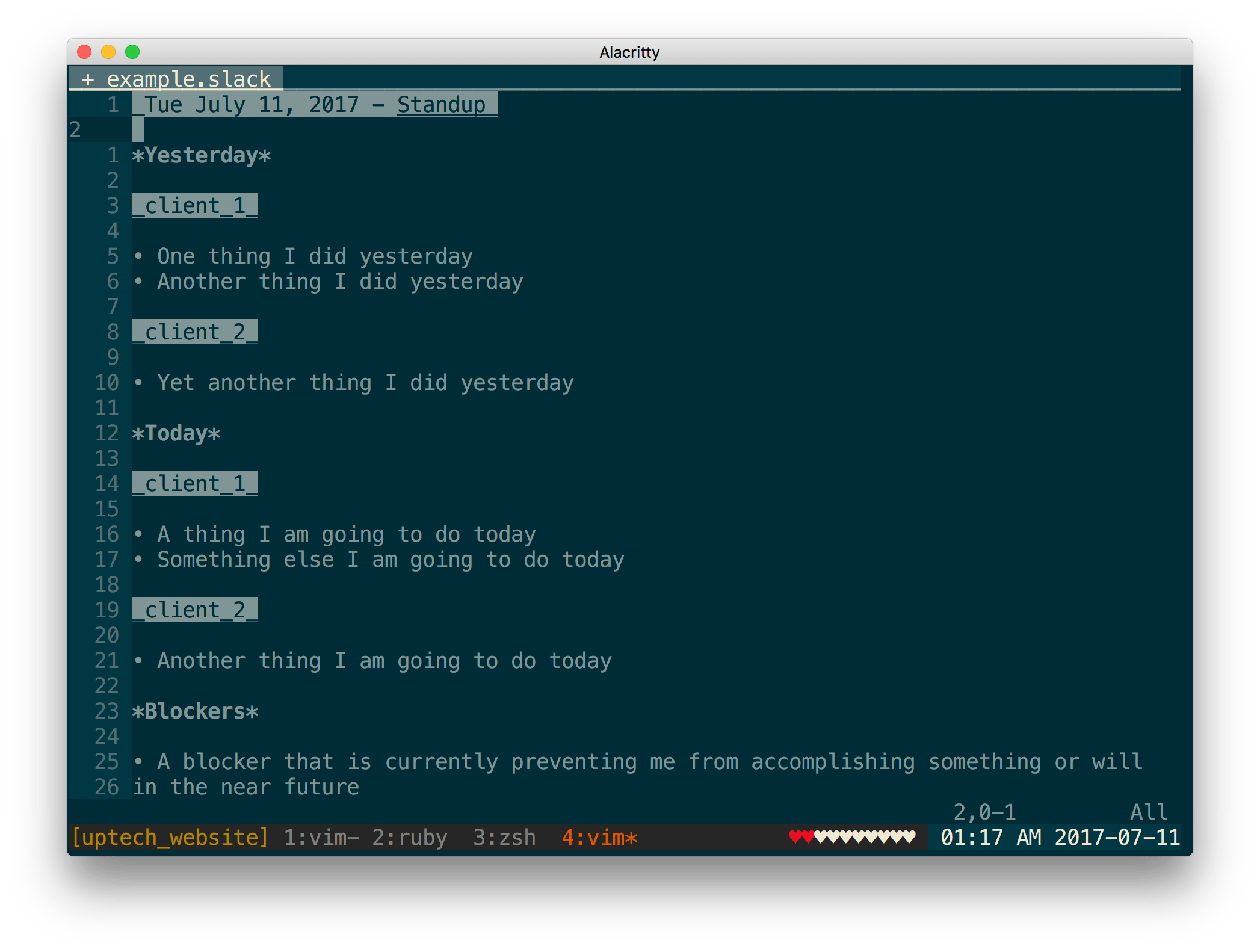 This allows you to have a standups.slack file to facilitate keeping historical track of your standups in an easily searchable format where you keep the most recent standup at the top of the file. Some people even like to keep this in a Git repository so that their history is pushed up to a remote on a regular basis.