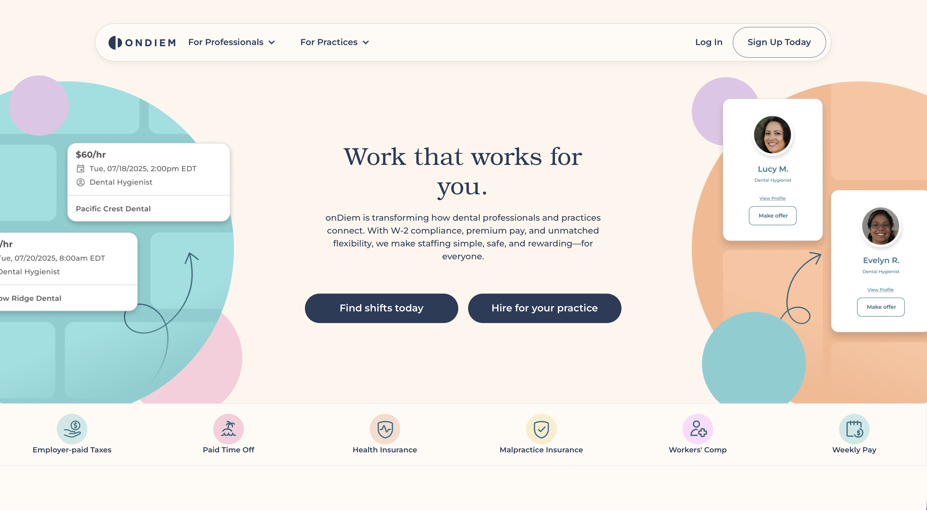 onDiem is a double-sided dental gig-economy platform servicing Dentists, Dental Hygienists, Dental Assistants, & Office Staff where I drove engineering strategy and delivery. Established and operationalized a formal SDLC and modern product development practices across the organization. Led the transition from manual to automated payroll, enabling scalable, compliant, and reliable operations. Defined core platform libraries, tooling, and architectural standards to improve consistency and velocity across teams. Led data engineering and business analysis initiatives to surface insights and identify revenue growth opportunities, informing product and operational decision-making. Acted as a technical mentor and advisor across backend, web, and mobile disciplines while governing and guiding multi-team initiatives from concept through delivery.
